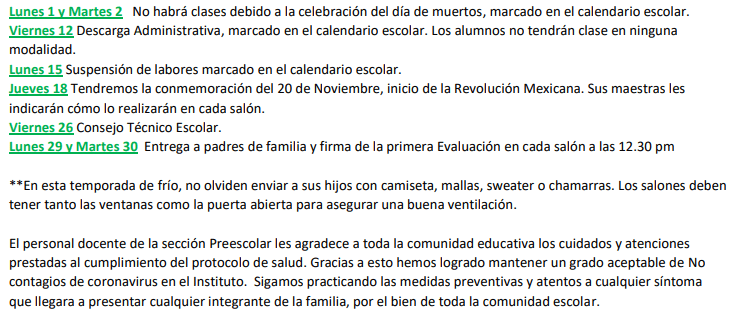 Recordemos que es temporada de frío y enfermedades, por lo que, si sus hijos se encuentran enfermos no los traigan a clases y consulten al médico para su atención, tomen en cuenta que los salones son fríos y deben estar bien ventilados por lo que les solicitamos enviarlos bien abrigados.
